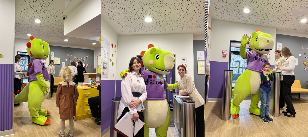 Утро началось с праздничной атмосферы: гостей встречал талисман школы — Дискаврик, создавая ощущение большого события.
